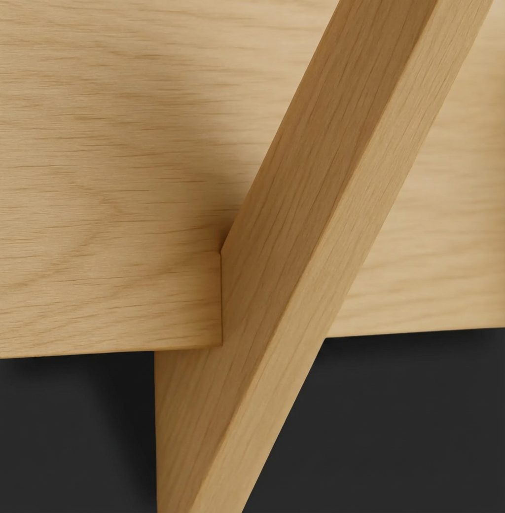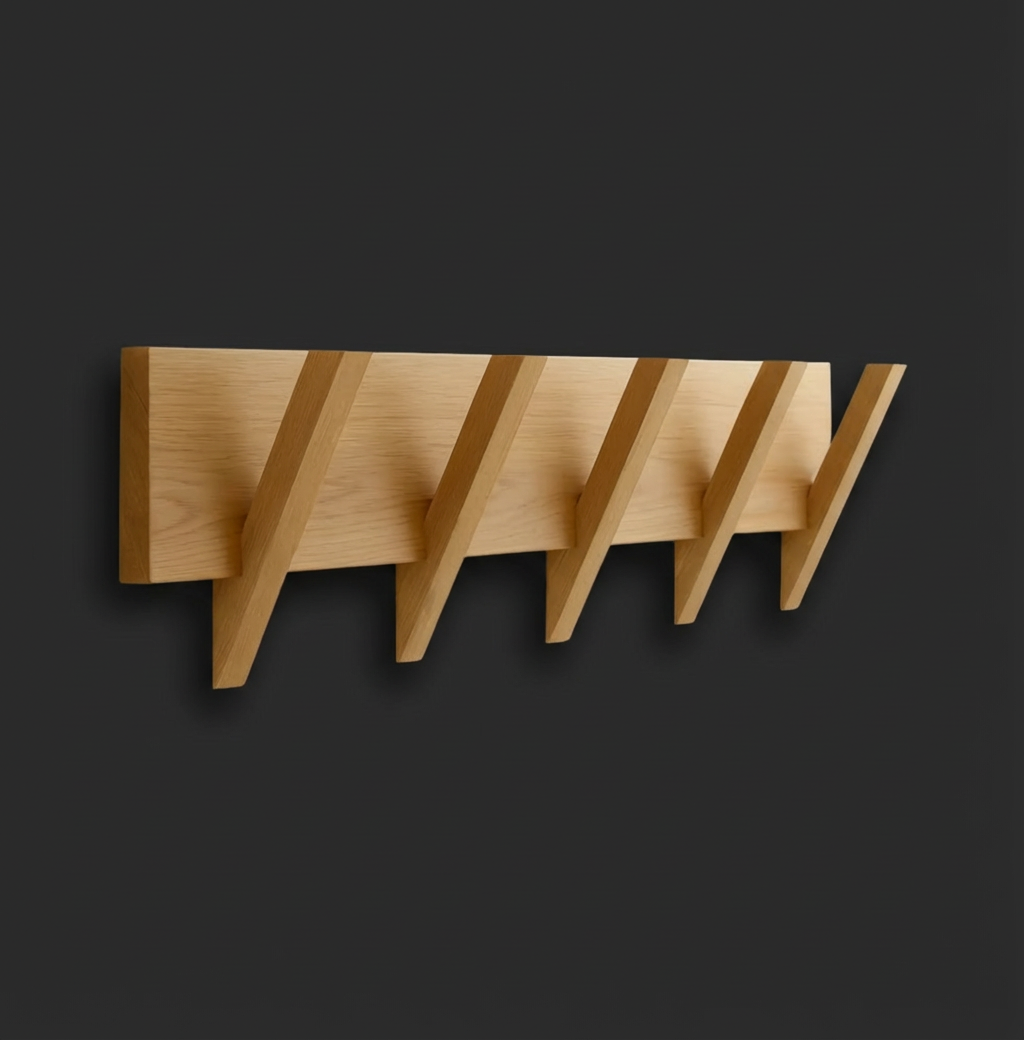 Align er defineret af præcision. Her er de traditionelle rundstokke erstattet af massive, kileformede stave, der bryder væggen i en fast, beroligende rytme. Designet refererer direkte til snedkerfagets klemmer og fungerer som et æstetisk relief i rummet. Hver knage er vinklet præcist opad for at gribe tøjet sikkert. En funktionel minimalisme, der står som en skulptur, både med og uden overtøj.