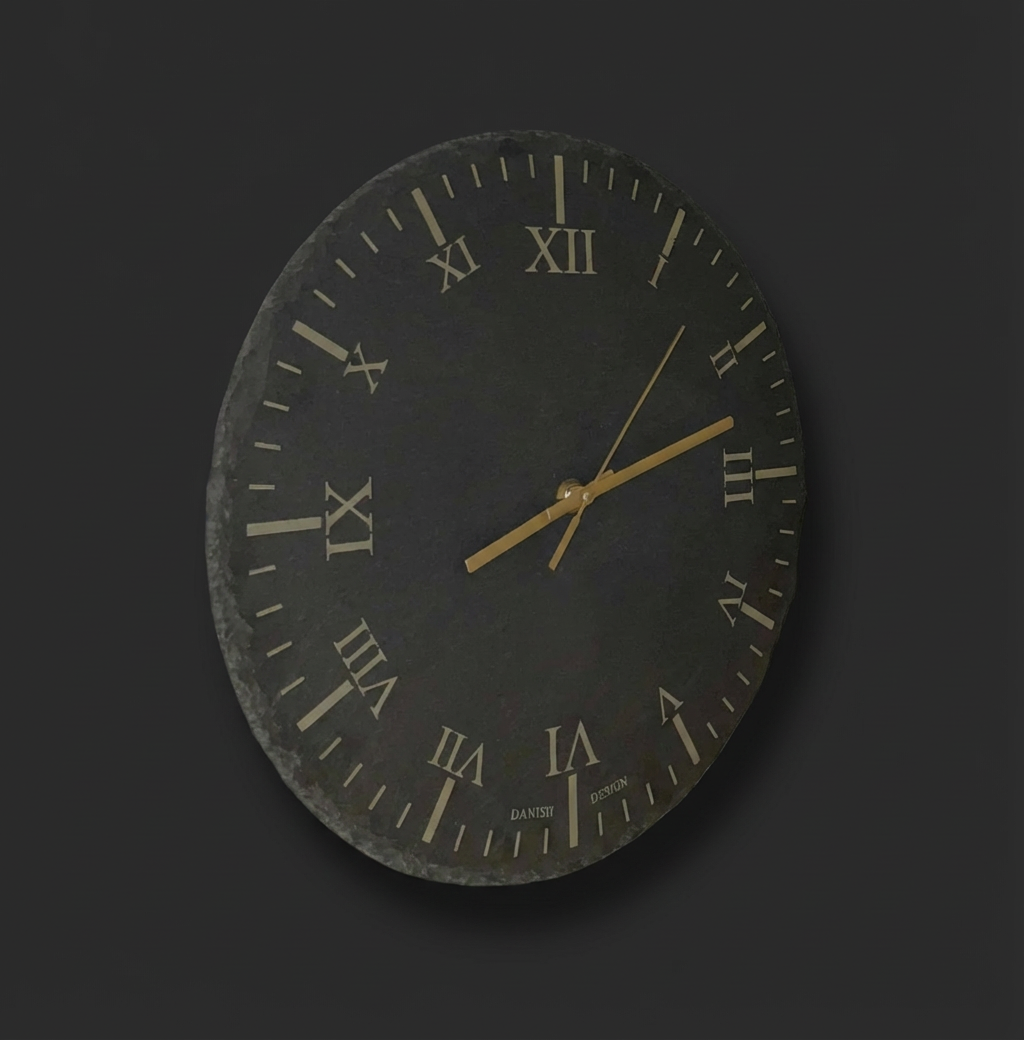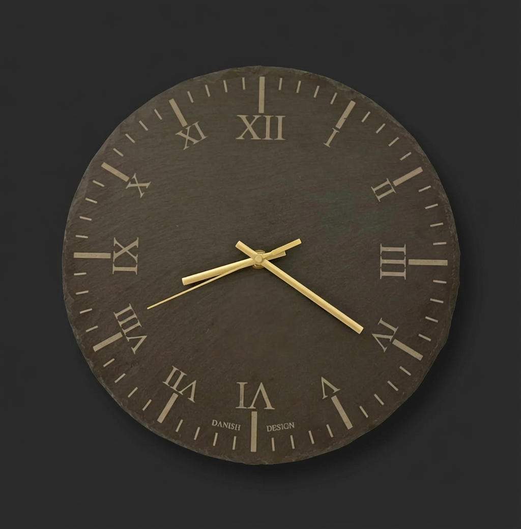 Vera er et studie i kontraster. Urskiven er hugget i ægte skifer med en rå, brækket kant, der gør hvert ur unikt. Mod den mørke sten står viserne i gylden messing og fanger lyset. Et funktionelt kunstværk der minder os om at sætte tempoet ned.
