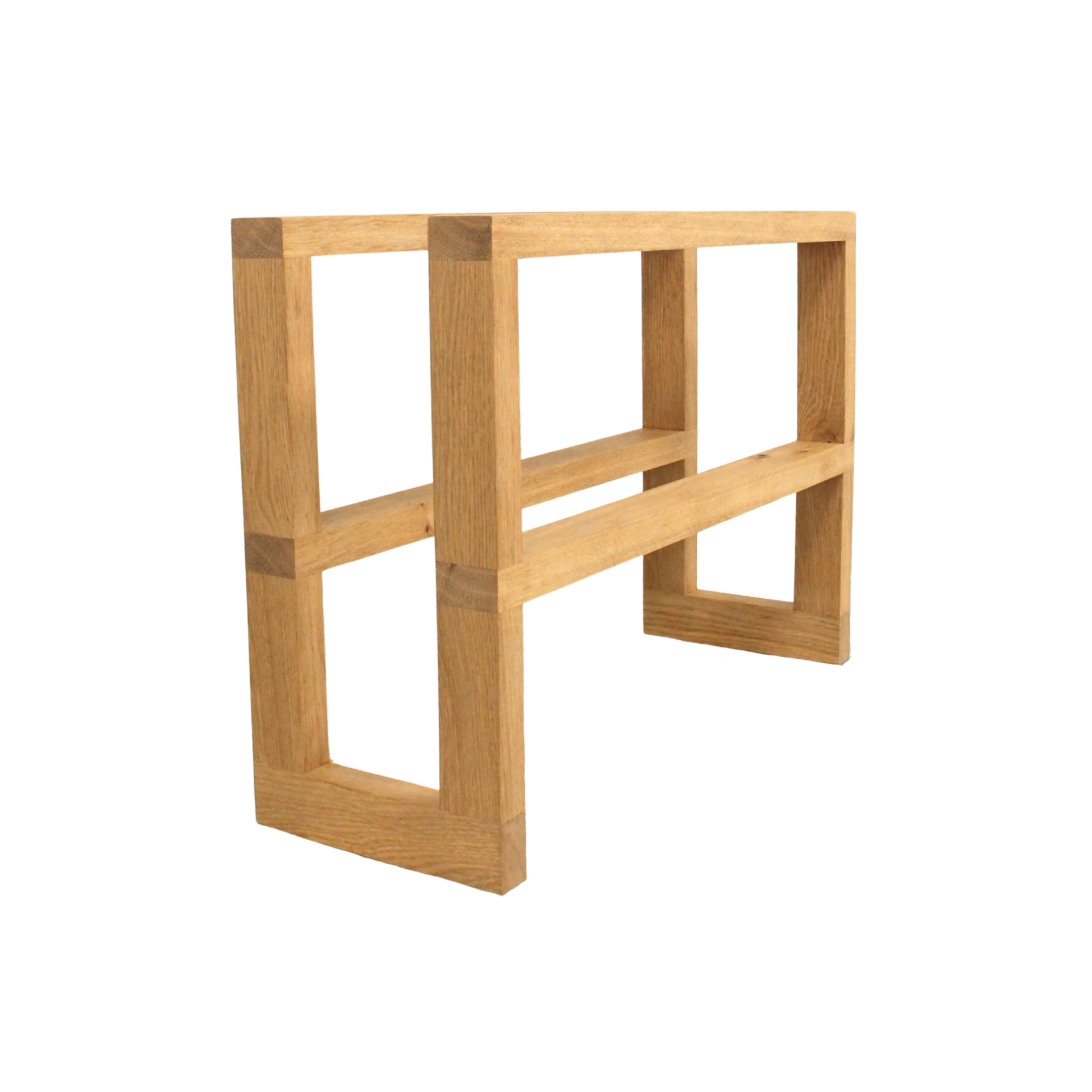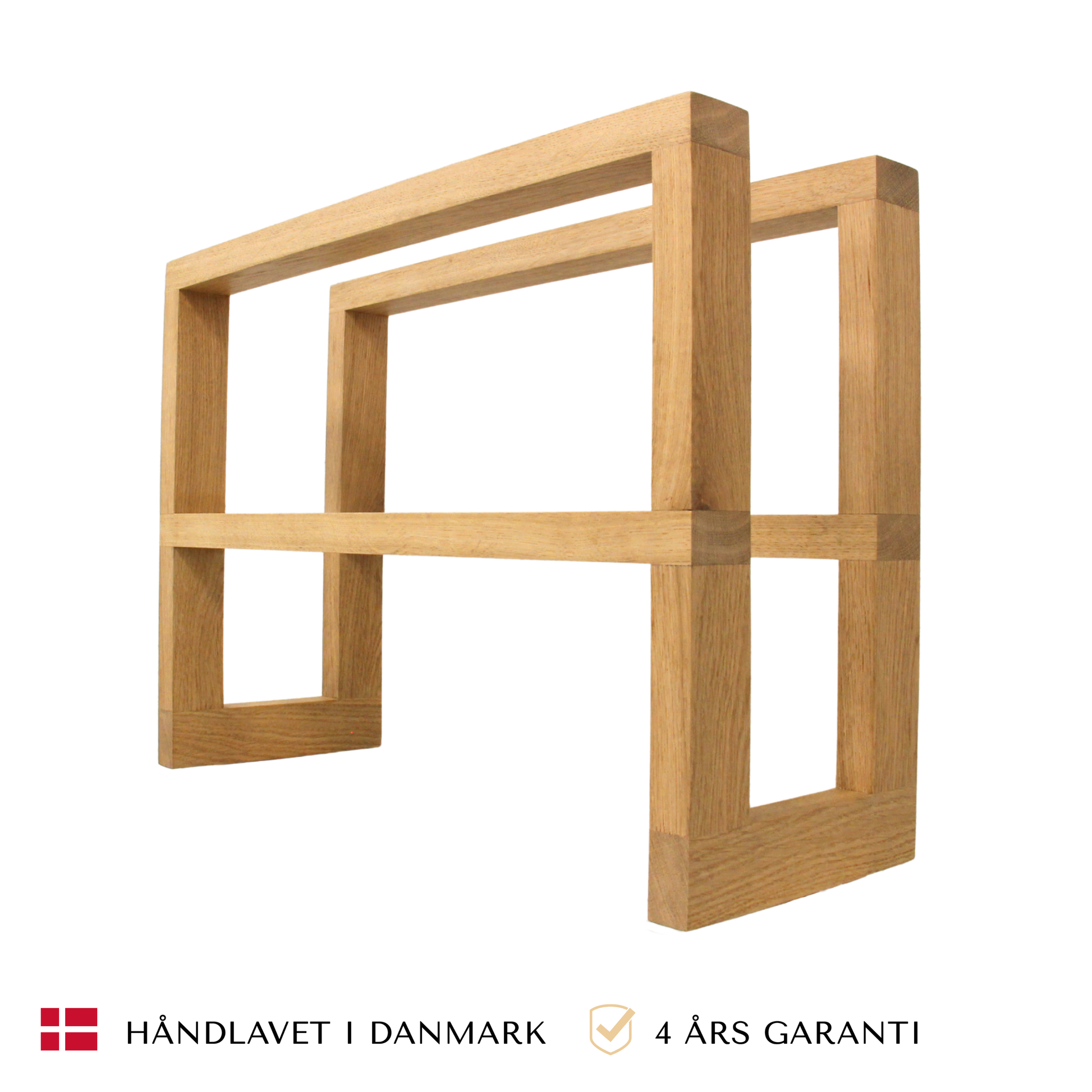 Vi arbejder udelukkende med FSC-certificeret egetræ af højeste kvalitet. Egetræ er valgt for sin enestående hårdhed, sin smukke og varierede årestruktur samt sin evne til at udvikle en endnu dybere og varmere patina over tid. Reolen er behandlet med en mat lak, der beskytter træet mod daglig brug, samtidig med at den lader træet ånde og bevarer sin taktile, sanselige overflade.